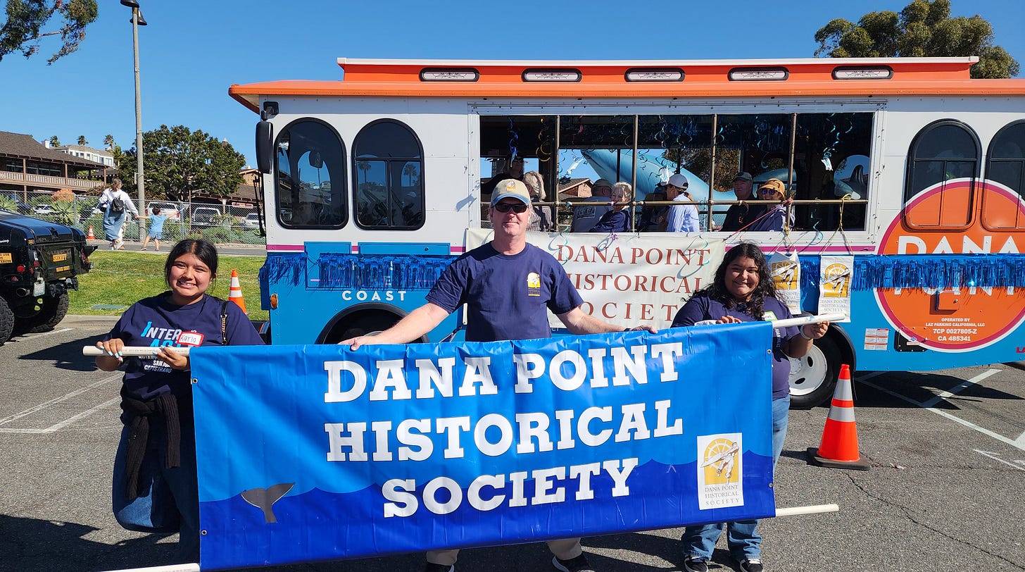 Several members of the Historical Society rode in the Festival of Whales in March. Teen volunteers from local Rotary Clubs’ Interact Clubs decorated our trolley, provided by the the City of Dana Point, and carried our sign for the parade. Board member Gary Macrides made our parade arrangements and is pictured with two Interact volunteers.
