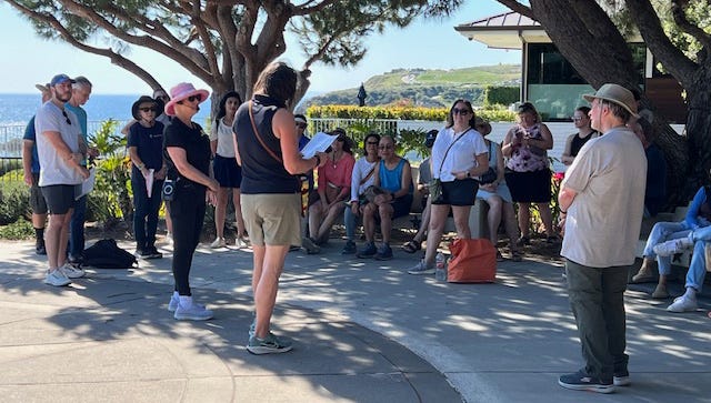 Our founding board member, Elizabeth Bamattre, along with husband Bill, led our Festival of Whales tour groups on Saturday and Sunday, March 7 & 8. Despite warm temperatures, nearly 100 people braved the heat to take the Society’s historic walking tour of downtown Dana Point,