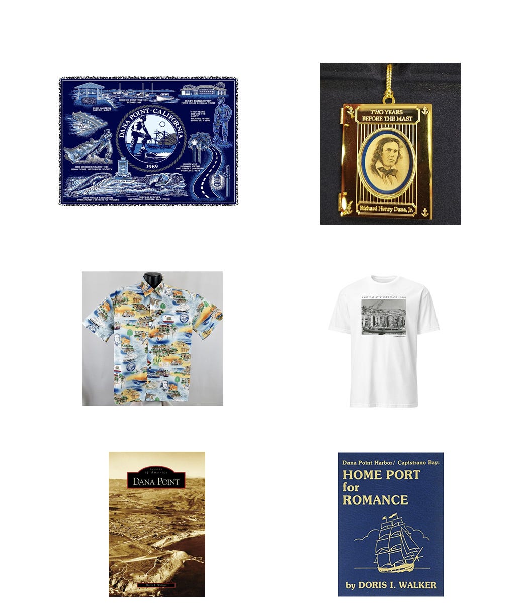 Pictured from top left: Our cotton afghan featuring the sites of Dana Point; Our newest ornament showing R.H. Dana; Our Hawaiian shirt featuring the sites of Dana Point; Our “Last Day of Killer Dana” T-Shirt; Paperback of the history of Dana Point by Doris I. Walker; Hardback edition of Home Port for Romance (the history of Dana Point) by Doris I. Walker.