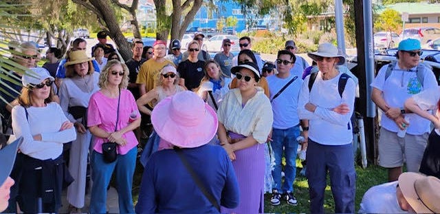which includes homes and businesses built during the original development of the city in the 1920s and other cultural landmarks, as well. Elizabeth can be seen in the pink hat speaking to the tour guests.