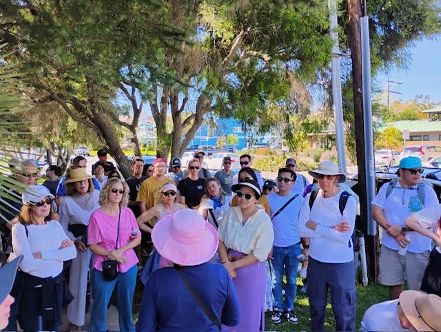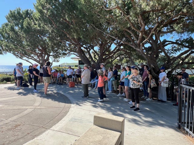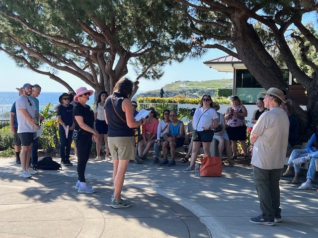 Our founding board member, Elizabeth Bamattre, along with husband Bill, led our Festival of Whales tour groups on Saturday and Sunday, March 7 & 8. Despite warm temperatures, nearly 100 people braved the heat to take the Society's historic walking tour of downtown Dana Point, which includes homes and businesses built during the original development of the city in the 1920s, and includes other cultural landmarks, as well. Elizabeth can be seen in the pink hat speaking to the tour guests. Photos by Michael Jiang and Bill Bamattre.